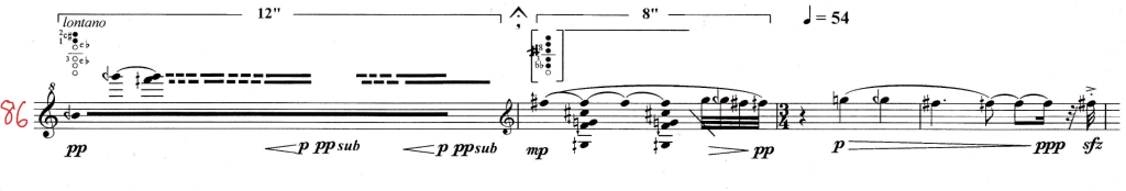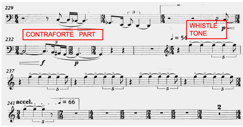 The whistle tone was also used in Johannes Kalitzke’s ensemble composition, Werckmeister Harmonies 2022, written for Klangforum Wien 2023. This excerpt from the live performance features a Heckelphone solo before the contraforte whistle tone of G7.